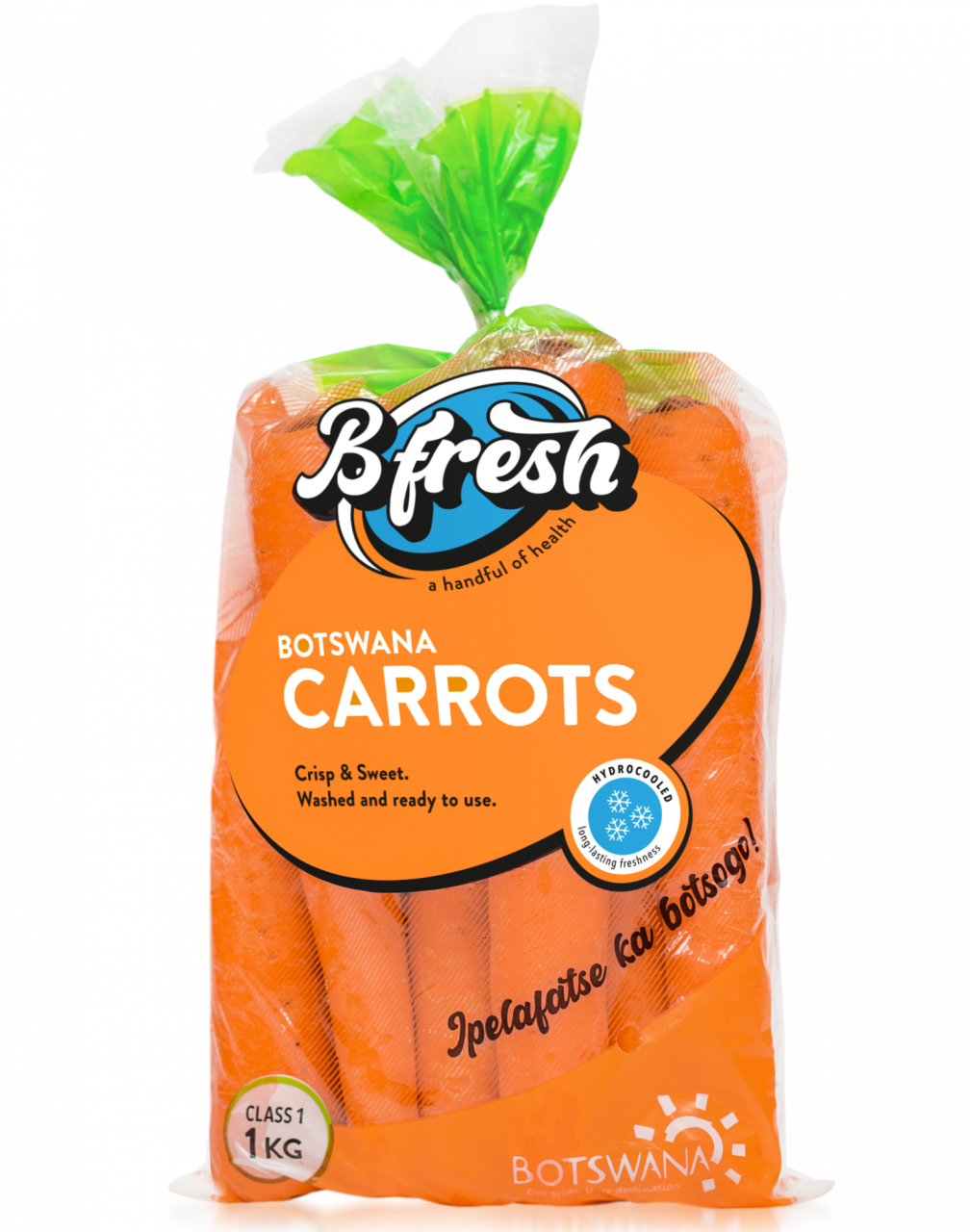 | 1kg B-Fresh Carrots | Washed, Brush-polished, Hydro-cooled | 10 x 1kg units per bag 100 bags per pallet |